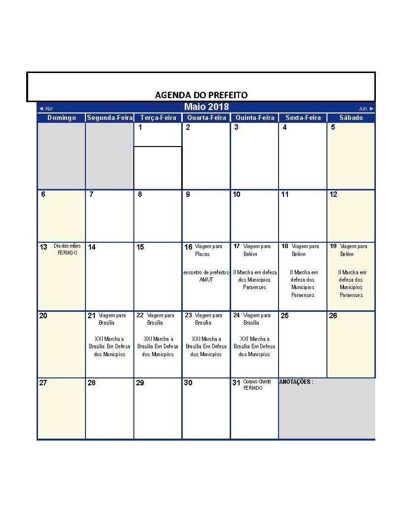 [18-0005] Agenda do Prefeito do mês de Maio de 2018 16/05/2018