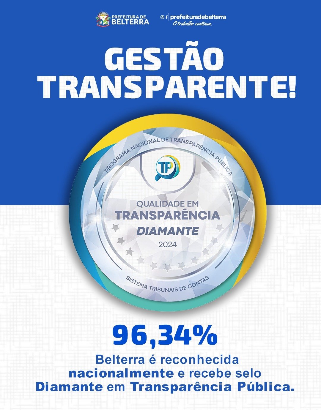 PELA TERCEIRA VEZ CONSECUTIVA, A PREFEITURA DE BELTERRA CONQUISTA O SELO DIAMANTE EM TRANSPARÊNCIA PÚBLICA