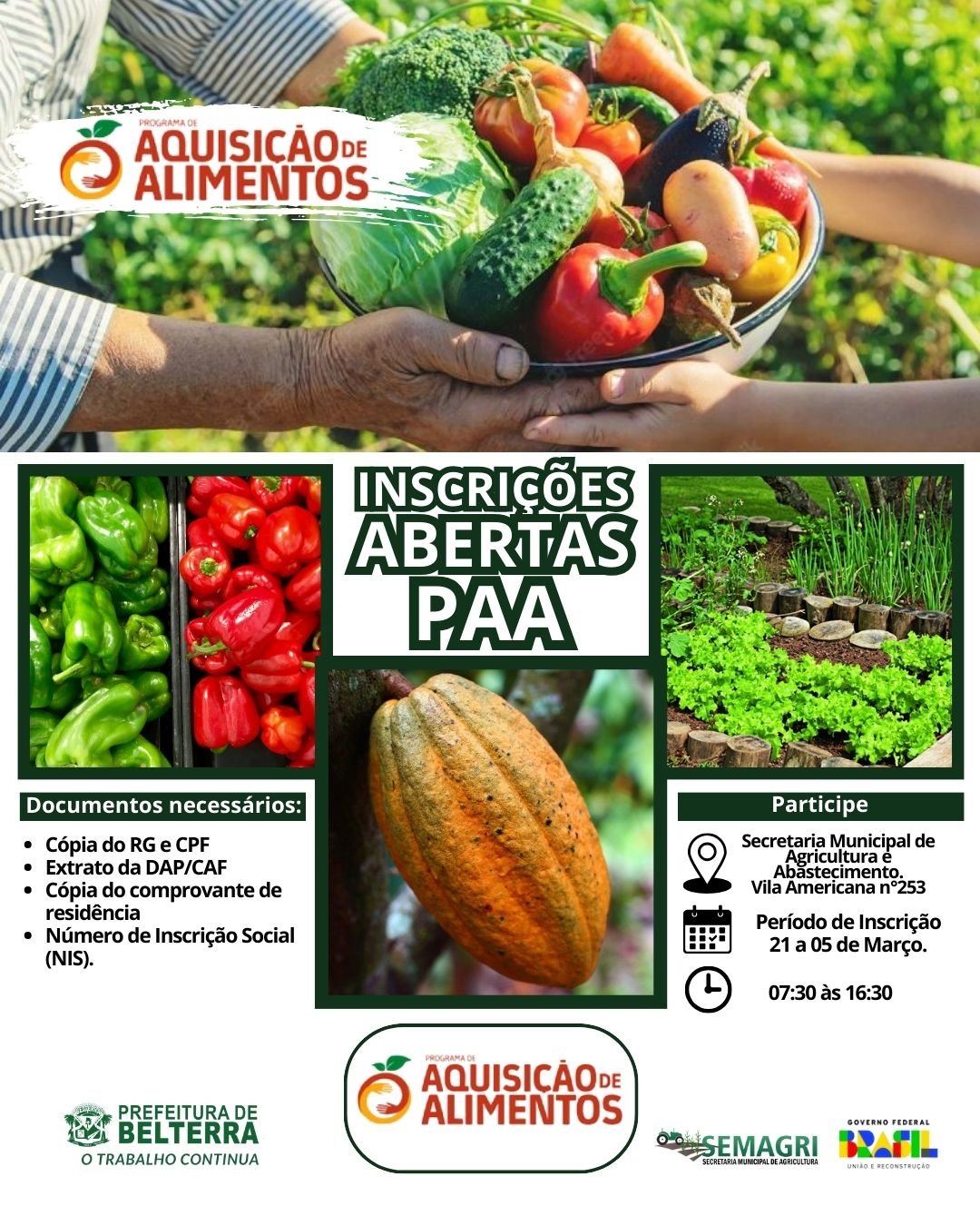 SEMAGRI DE BELTERRA ABRE INSCRIÇÕES PARA O PROGRAMA DE AQUISIÇÃO DE ALIMENTOS FEDERAL