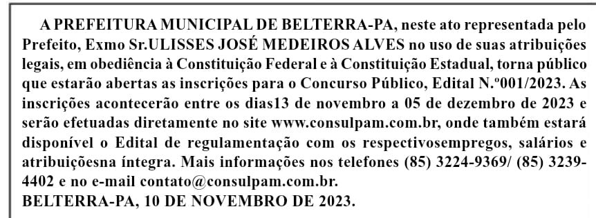 INSCRIÇÕES PARA CONCURSO PÚBLICO DA PREFEITURA DE BELTERRA INICIAM EM 13 DE NOVEMBRO