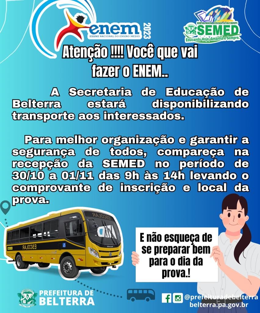 PREFEITURA DE BELTERRA DISPONIBILIZA TRANSPORTE GRATUITO PARA CANDIDATOS QUE REALIZARÃO AS PROVAS DO ENEM EM SANTARÉM