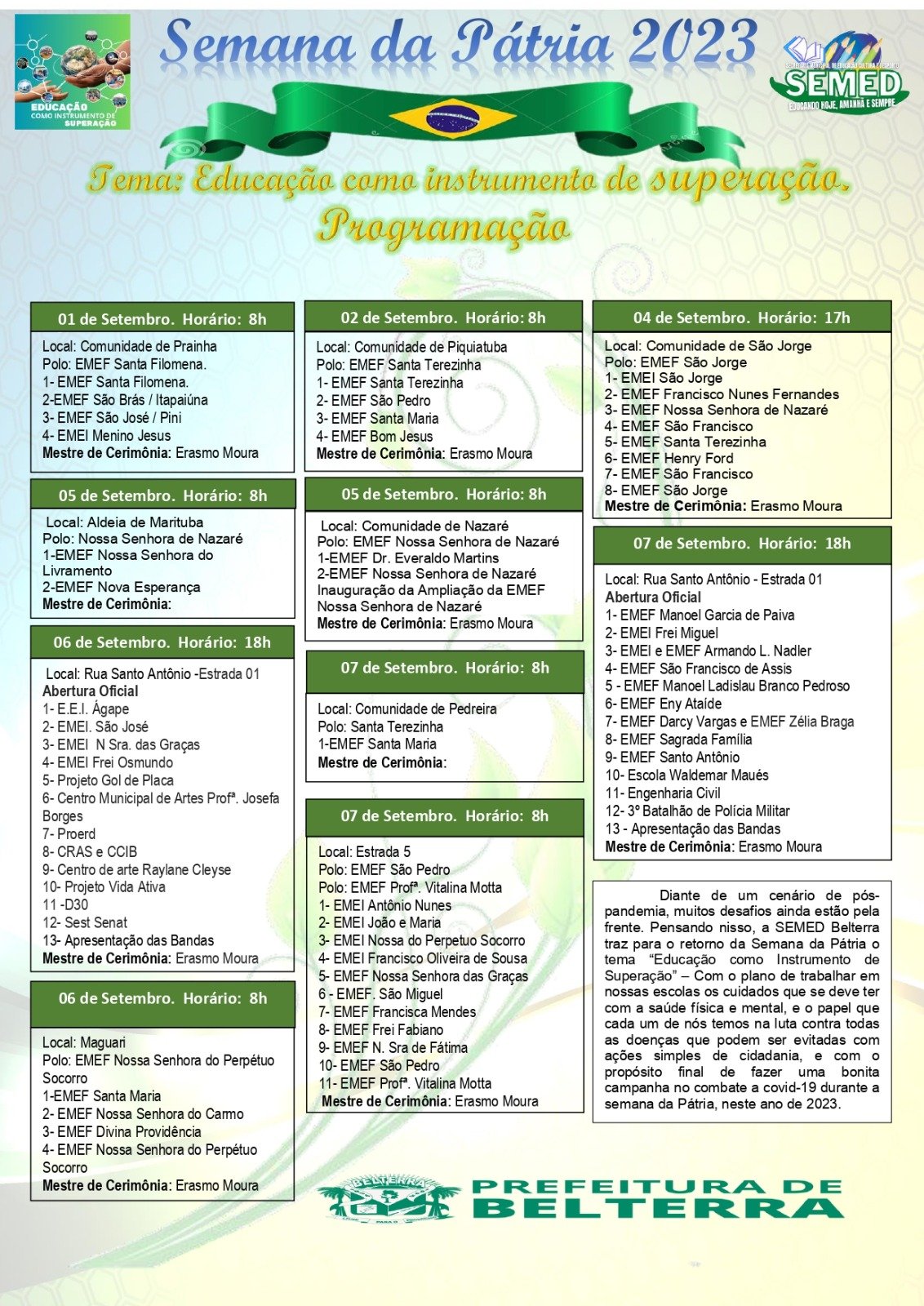 PREFEITURA DIVULGA PROGRAMAÇÃO OFICIAL PARA A SEMANA DA PÁTRIA 2023 EM BELTERRA